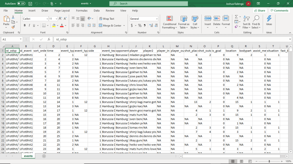 The first problem to solve when creating an xG model is finding a suitable dataset. Unfortunately, most useful football data is privately owned and you’d have to be extremely wealthy to afford it. As this blog hasn’t made me enough money (or any money for that matter), I spent several hours searching every corner of the internet for some free data. Luckily, I came across this awesome dataset on the data science website Kaggle. To download the data (it is an excel CSV file), you have to create an account first – but otherwise, it is completely free.