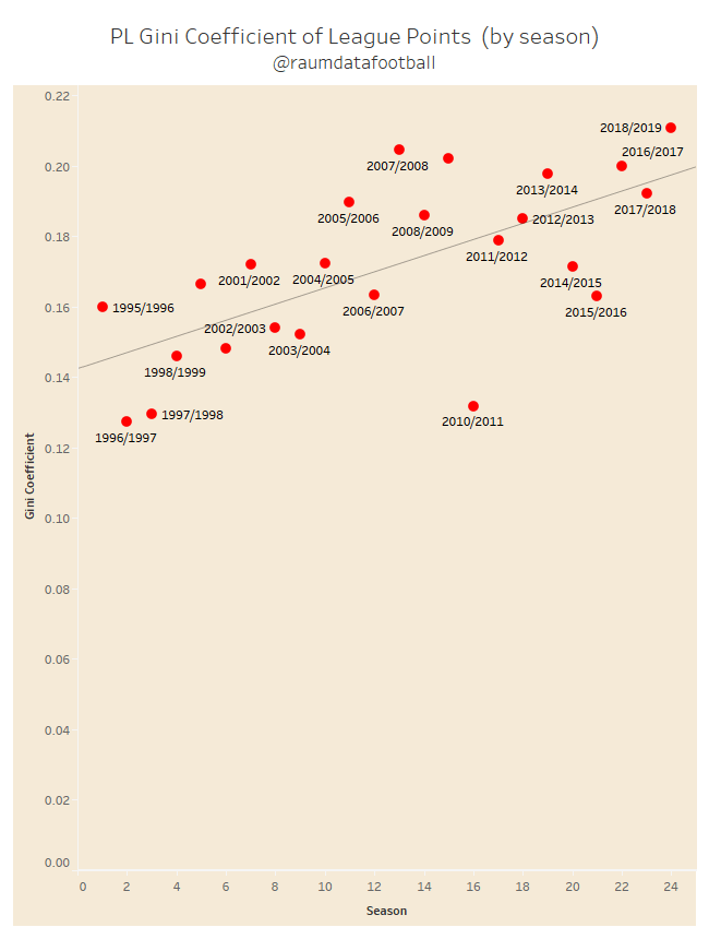 To measure ‘competitiveness’, I collected league table data for every full Premier League season since 1995/1996. I then calculated a Gini coefficient to measure the amount of ‘inequality’ in the distribution of points among the teams.